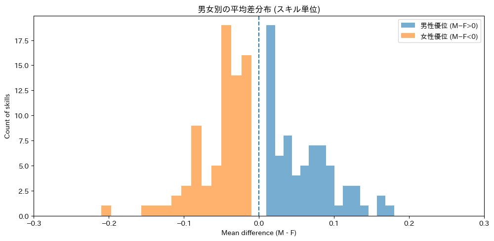 その結果、男性条件で高く評価されたスキルは72件(平均差 +0.060)、女性条件で高く評価されたスキルは75件(平均差 −0.053)であった。